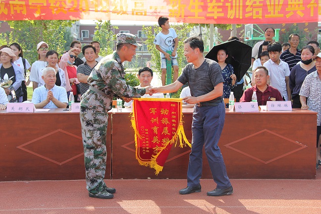 结业典礼由朱挺校长主持,班宜荣校长致闭营辞,班校长代表学校感谢承训的全体教官,希望同学们以这次军训为起点,树立远大理想,继承和发扬部队的优良传统和作风,严于律己,在今后的学习中取得更大的进步。优秀学员代表的发言,由衷地表达了对学校提供训练平台、教官严中有爱、老师关怀照顾的感谢,同时也表达了自己克服困难、顽强拼搏的自豪感。教官代表的讲话体现军队优良作风和军人的人格魅力。班校长代表学校向教官赠送锦旗,王平校长宣布获得军训汇报表演的先进集体、班主任、教官和先进个人名单,并举行颁奖仪式。
