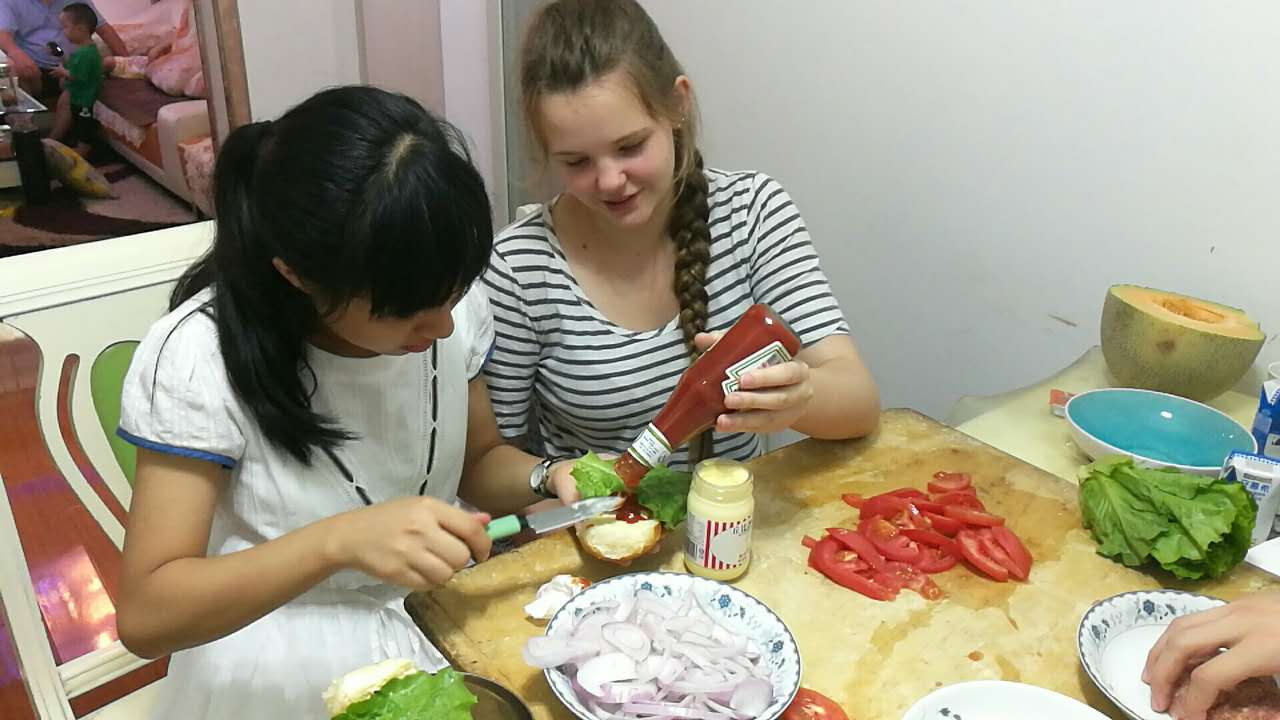 Mr. Carl and Canadian students cut onions and tomatoes, fried beef to teach Chinese students how to make hamburgers. Wei Yuxiang and Nie Huihui’ s parents made Beijing Roast Duck, stewed fish and other Chinese specialties. All together tasted Sino-Canadian cuisines.