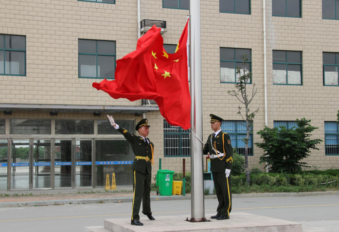 英姿飒爽的国旗护卫队护送鲜艳的五星红旗入场,伴随着庄严的《义勇军进行曲》,五星红旗冉冉升起,迎风飘扬,全体师生肃然而立,行注目礼。